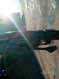 vendo bici per inutilizzo, cambio nuovo , attacco manubrio nuovo (celeste) manopole nere nuove e porta borraccia, copriraggi blu e celesti e in fine sella nuova e possiede dei tubi blu alla ruota posteriore . la bici presenta lievi segni di usura , ma è senza catena . prezzo trattabile, no perditempo.