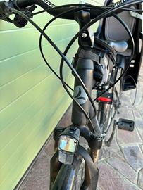 Telaio in alluminio, forcella ammortizzata, cambio Shimano, parafanghi, cavalletto e luci