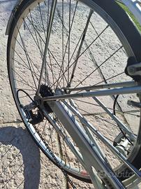 Vendo bellísima bici, poco uso, marca Alpina, modello Rondine accessoriata con: cestino, portapacchi, cavalletto, freni in alluminio, telaio alluminio, ruote originali, cambio Shimano 6 velocità, parafanghi, luce con dinamo. Tutti i componenti sono originali, sempre tenuta in interno della casa quando non usata, quindi ha pochissima ossidazione.