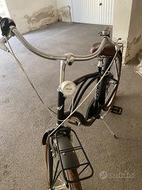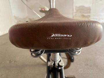 Bici da passeggio Made in italy con sella in pelle e dettagli marroni . Bici leggerissima peso 13kg telaio alluminio . Cambio shimano 7 marce. Entrambi fanali. Solo ruota bucata da fare bucatura. Ruote ancora originali. Mai usata come da foto
