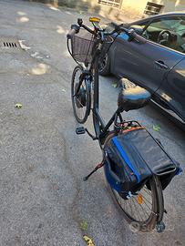 bici 28 con cambio shimano ma soprattutto ruota anteriore motorizzata con Imortor 3.0 Bluethooth. si collega allo smartphone e con apposita app ben fatta si decide la velocità e il modo eco sport ecc. per Donna Uomo insomma unisex, praticamente nuova batteria performante 60km in modalità eco, caricabatteria alimentatore, porta telefono torcia led a manubrio, lampada classica, faretto dietro che funge di allarme antifurto con telecomando ricaricabile, catena senza chiave con lettore di impronte digitale, sacche posteriori contenenti alcuni attrezzi utili.