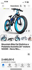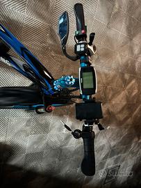 Vendo Mountain Bike Fat Elettrica a Pedalata Assistita 26” motore 1000W - Nero/Blu. La bici costa nuova su note piattaforme circa 2.500€ senza gli accessori che ho aggiunto e che sono compresi nella vendita. La bici è davvero paragonabile al nuovo perche tenuta sempre in box e utilizzata 3 o 4 volte quindi con pochissimi chilometri (124 per l’esattezza).