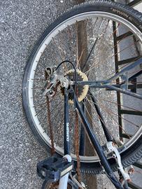 Vendo per inutilizzo bicicletta mountainbike con ammortizzatori. La bici è funzionante, ma presenta dei segni di ruggine. Gomme in discreto stato, posteriore forata.
