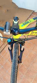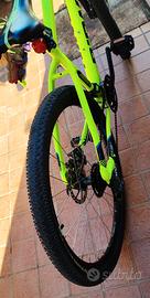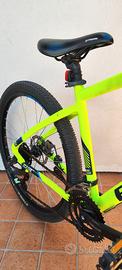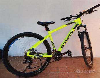 Vendo fantastica MTB B-TWIN size M di colore giallo fluo, come nuova, usata pochissimo e poi tenuta imballata in garage, completa di luci avanti e dietro, campanello, cavalletto laterale e chiusura a 4 numeri, caratteristiche nel dettaglio:Il Telaio della MTB ROCKRIDER 520 è in alluminio 6061 e pesa solo 1,9kg in taglia M. Più stabile in curva grazie al movimento centrale posizionato più in basso. La SOSPENSIONE ANTERIORE Affronta i nuovi ostacoli (radici, sassi, pietre…) in tutta serenità grazie alla forcella anteriore con escursione di 80 mm.Facile: regola la durezza della forcella in funzione del tuo peso grazie alla rotella.CAMBIO E TRASMISSIONE 3 corone con 8 velocità, per un ampio range di 24 velocità 2 comandi