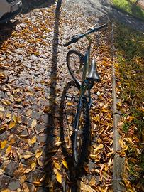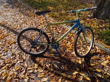 È una mountain bike da 26” in acciaio, restaurata con verniciatura sfumata giallo‑blu in stile vintage. Ha forcella rigida, manubrio dritto con comandi al cambio posteriore e componenti semplici ma funzionale.