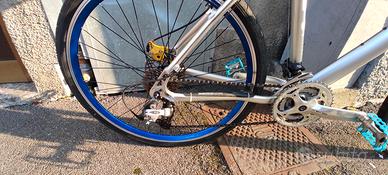 bici MTB front ,con ruote stradali per piste ciclabili.in ottime condizioni.24velocità.vedi foto, allegate,.telaio manubrio attacco manubrio reggi sella pedali ruote tutto in alluminio 6016.armortizata front,freni a disco.solo ritiro a mano no spedizzioni.PREZZO TRATTABILE.