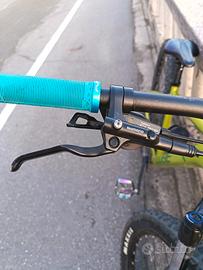 Telaio in alluminio con i fili del freno e cambio che passano all'interno,cambio shimano, monocorona davanti,con 11 rapporti dietro,freni a disco idraulici shimano,forcella rockshok.Come si vede dalle foto la bici ha manopole,attaccomanubrio e pedali cambiati per chi volesse fornisco anche i pezzi originali.Vendo per passaggio ad altra tipologia di bici.