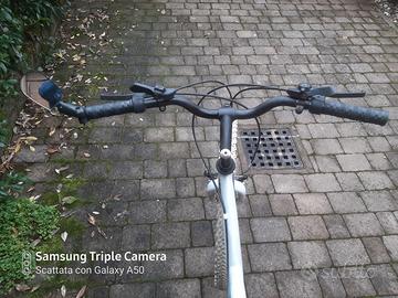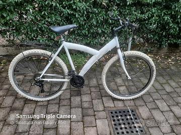 Bici da 26" MTB-Trekking tenuta molto bene, con uno specchietto retrovisore bello e funzionale. Tutti componenti funzionanti: Freni, cambio shimano (anteriore con 3 cambi e posteriore con 7 cambi) e ciclistica perfettamente funzionanti. Ruote e in alluminio, gomme "Kyte" bianche ottime. Luci a LED e portabagagli posteriore. Niente ruggine poichè tenuta in garage. 65 euro