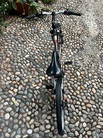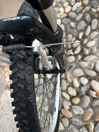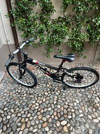 Bicicletta Mountain Bike da bambino di marca Doublezz. Telaio, forcella e manubrio in acciaio. Freni a pinza e ammortizzatori anteriori funzionanti. Cambio posteriore Shimano a 6 velocità e anteriore a 3 velocità. Sellino comodo regolabile. Accessori: cavalletto in alluminio funzionante e portaborraccia.