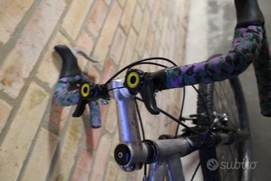 Bici MTB (anni 2000 penso) ruota del 26 con copertoni spessi antiforatura; cambi 6x3 velocità con leve sul manubrio; il proprietario prima di me aveva colorato il telaio con della vernice nera che purtroppo si era scrostata tutta; ho cercato di pulirla il più possibile, rimangono comunque i segni della lavorazione; funzionante con acciacchi del tempo (consiglio cambio pastiglie freni perché consumate e rumorose).