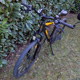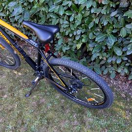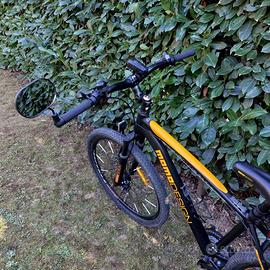 Bici MTB MOMO Design con ruote da 27,5 in ottime condizioni generali. Comprende uno specchietto laterale, un cavalletto rinforzato, le luci anteriori e posteriori. L'attacco del manubrio è stato cambiato con uno regolabile aheadset oversize ma consegno anche quello originale