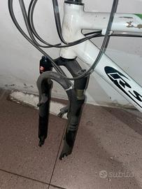 Mtb in carbonio cerchi in lega da 26 cambio a 8 rapporti posteriori e 3 anteriori freni idraulici schimano xtr cambio sdram forcelle rock shox idrauliche con regolazione altezza blocco forcella per salite ripide e regolazione rebound per escursione piu rapida o lenta