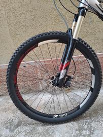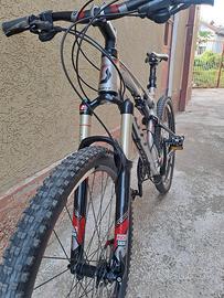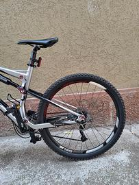 bici scott spark 40 biamorrizzata anteriore roch schok da 120 mm e posteriore DT swiss da 120 mm entrambi bloccabili, freni idraulici schimano con disci da 180 mm, cerchioni DT swiss, copertoni Kenda da 26×2.10 ,rapporti 3×10 cambio schimano xt, pedali deore xt.