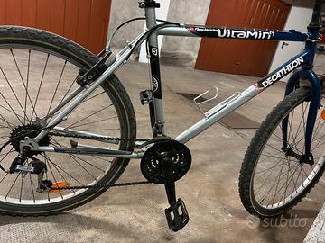 Bicicletta mountain bike Decathlon con cambio da 21 rapporti, ruota da 26 e telaio L perfetta per persone alte tra 170 e 185 cm. La bici non necessita di alcun lavoro, è pronta all’uso e con borsa posteriore staccabile inclusa.