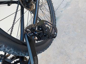 la bici è in perfette condizioni tenuta sempre bene pulita revisionata ecc, pedali con placche o si può usare con scarpe normali , cambio scimano 9 velocità tripla corona , freni a disco, sospensione regolabile e si può staccare quando si viaggia sulla strada , ruote da 29, molto leggera ottima per chi vuole iniziare attività di fuori strada o per giri domenicali ha la possibilità di mettere anche copertoni stradali