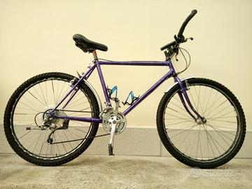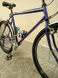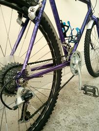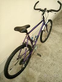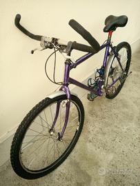 Bicicletta Mountain bike Usata con telaio in acciaio di colore viola metallizzato. Monta ruote da 26 pollici, freni Cantilever, cambio Shimano a 21 velocità, manubrio con curvatura con corni integrati, sella sportiva nuova, catarifrangenti, 2 x portaborraccia, cavalletto laterale, parafanghi, con luci LED anteriori e posteriori.