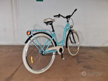 Goetze Style City Bike da donna ruote in alluminio da 28 pollici - copertoni da 40mm telaio e forcella in acciaio - trasmissione ad single speed - freno posteriore a contropedale - freno anteriore V-brake - illuminazione anteriore e posteriore a LED - porta cestino su manubrio – campanello - sella confort - carter proteggi catena - cavalletto laterale. Consegna a mano a Bologna e dintorni