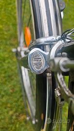 Marca Olympia modello Lusso di colore nero che divideva il mercato delle biciclette da passeggio con la Bianchi. Monta telaio numerato, cerchi in alluminio Nisi da 28 con raggi neri e copertoni Michelin di cui uno nuovo, parafanghi con verniciatura e cromature alternata, sella comoda in pelle modello muso di cane originale Olympia, lucchetto ad artiglione, campanello, cavalletto, gommone appoggia muro, manubrio cromato Varese e impianto luci funzionante a dinamo Mondial.