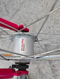 Bellissima bici da città,usata pochissime volte, praticamente nuova Ha 7 marce integrate nel mozzo posteriore,quindi poca manutenzione, dinamo integrato nel mozzo anteriore con luce standby (rimane accesa al semaforo poi si ferma da sola ) La bici e in alluminio e veramente leggerissima e di alta qualità,comprata in Germania Si vende per passaggio a bici elettrica Non e una bici da Despar,quindi non fate offerte stupide!
