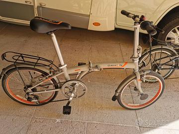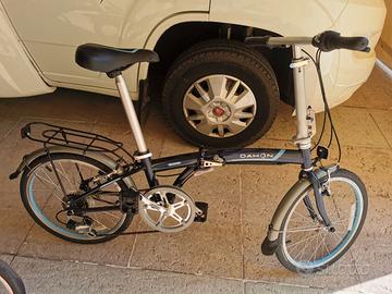coppia bici pieghevoli DAHON Suv. Una azzurro chiaro e l'altra blu cambio Shimano a 6 vie. Completa di istruzioni e CD per l'utilizzo . Ideali per spostamenti in città, garage camper o barca. Preferisco la vendita in coppia. Dahon SUV D6 PIEGHEVOLE CITY URBAN 6V 20 •Formato ruota: 20″ •Formato da chiusa: 65 x 34 x 84cm (25.6 x 13.4 x 33.1) •Peso: 14.4 kg (31.7 lbs) •Velocità: 6 •Taglia telaio: 1 •Distanza tra sella e manubrio: min. 610 mm (24.0″), max. 640 mm (25.1″) •Distanza tra sella e pedali: min: 640 mm (25.1″), max: 880 mm (34.6″) •Altezza ciclista consigliata: 134 – 184 cm (4’5″ – 6″) •Massimo peso ciclista: 105 kg (231 lbs) •Telaio: Acciaio Hi.ten con tecnologia D-Clamp •Forcella: Acciaio Hi Ten •Attacco manubrio: Acciaio Hi Ten regolabile con tecnologia Fusion •Manubrio: un pezzo, 530mm piatto •Serie sterzo: Dahon cuscinetti a sfere •Reggisella: Dahon 6061 alluminio, 33.9 x 580 mm •Chiusura Sella: Dahon Turtleneck •Freni: Winzip lega 110mm V-Brakes •Leve: Winzip Composite •Cavi: Dahon LiveWire 5.0 •Mozzo anteriore: Dahon Custom Compact 28H •Mozzo posteriore: Dahon Custom Compact 28H •Raggi: acciaio •Copertoni: Kenda K-West 20″ x 1.50 •Guarniture: JT0S1022P 1/2″ x 1/8″ x 52 d x 170mm x 9/16″ •Movimento centrale: sfere •Catena: KMC •Pacco pignoni: Shimano MF-TZ20 6 velocità •Cambio: Shimano RD-TY21 6 velocità •Comandi cambio: Shimano RevoShift 6 velocità •Pedali: Composite piattaforma •Cerchi: 20″ Alluminio 28H
