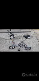 Piccola bici pieghevole con lucchetto, copertoni sgonfi per poco utilizzo.
