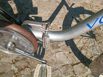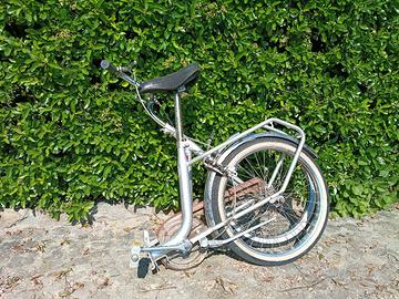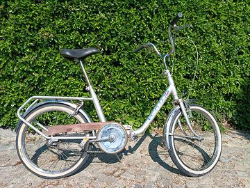 Vendo a malincuore per fare spazio in garage bici pieghevole da adulti ruota 20" anni 90 tutta originale. Ha bisogno di un po' di manutenzione ma è funzionante. Io l'ho usata con tanto di seggiolino bimbo fino a ieri. NB foto 5: il pacco pignoni è a 5 velocità ma la bici è sprovvista di cambio, però smollando la ruota dietro ed inserendo la catena su un altro pignone si ottiene un rapporto diverso...anche questo è un sistema antico di cambio rapporti. Pezzo d'epoca per veri amatori. Preferisco scambio a mano, ma essendo piccola ripiegata posso anche spedire.