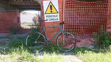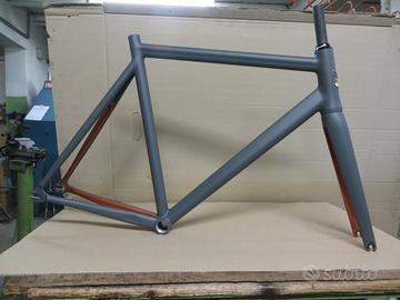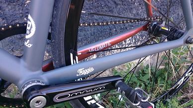 bici pista Faggin velomatic zero: telaio in alluminio su misura (54,5 x 55,5 sono alto 1,80) con forcella CONICA columbus in carbonio. Colorazione custom: grigio opaco con interni rame perlato. Guarnitura omnium, ruote mavic ellipse, reggisella e stem thomson, sella zoncolan (pedali non inclusi).