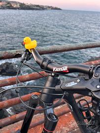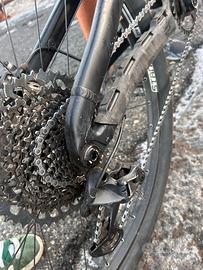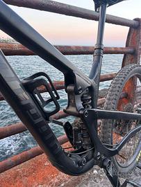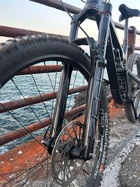 escursione 180mm avanti e dietro, dietro ammortizzatore a molla, avanti ad aria telescopico, manubrio renthal fatbar, freni g2r con dischi da 200mm, ed è una bici mullet (29-27,5), cambio sram eagle gx 12v e compertome dietro cambiato messo uno con una carcassa più resistente e l’ho fatto tubeless
