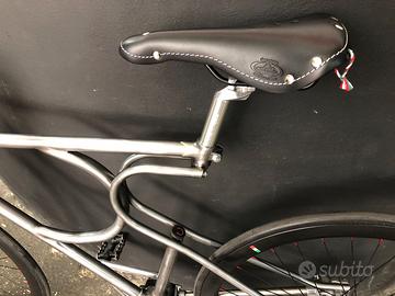 Bici prototipo in acciaio, costruita in un unico esemplare, con trasmissione a cardano e cambio a 3 marce integrate nel mozzo. Forcella anch'essa unico esemplare, costruita su misura, ammortizzata, stile anni '30. frenata integrale con unica leva, posteriore a tamburo e anteriore a disco ( Shimano, come il mozzo ruota) la bici manta 2 led posteriori incassati nel telaio, mentre all'anteriore una vecchia lanterna della ferrovia, modificata a led, sul lato sinistro del manubrio c'è un piccolo pulsante del claxon, ottimo per i pedoni. i cerchi ad alto profilo sono della GPM, A40 , i mozzi e raggi neri con nipples color rosso come altri piccoli particolari. sella Montegrappa in cuoio. Per la realizzazione sono state necessarie infinite ore di lavoro. tutte le saldature sono fatte a TIG, la bici è verniciata solo con vernice trasparente per risaltare il telaio. La bici è stata usata solo per pochissimi Km di test funzionamento dopo la realizzazione.