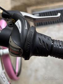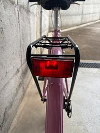 Presenta cambio shimano 6 marce, campanello rosa (aggiunto), luci funzionanti sia davanti che dietro, portapacchi nella parte retrostante.