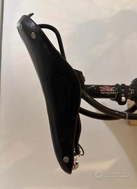Vendo bici scatto fisso, telaio nero con dettagli verdi. Sella e manopole in pelle marca Brooks. Campanello. La sella è legata al telaio con una piccola catena. Ha fatto tanta strada, adesso è da troppo tempo appena in casa. Ritiro a mano a Milano.