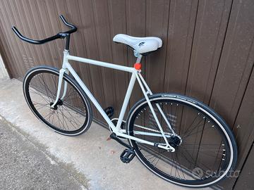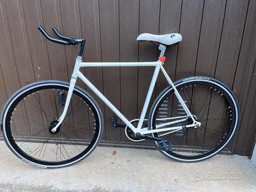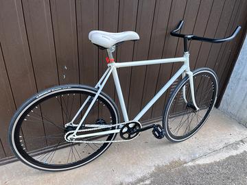 Bellissima bicicletta a scatto fisso con movimento a contro pedale color bianco perlato,rapporto di pedalata 42 a 18 adatto a qualsiasi tipo di strada, Bici costruita sul telaio vintage Legnano completamente restaurata con guarniture, ruote, selle manubrio, tutti i movimenti nuovi. Monta pneumatici Michelin Dynamic sport nuovi, su cerchioni a profilo alto. il movimento a contropedale conferisce a questa bici uno stile snello ed elegante unico nel suo genere, la libera da ogni tipo di antiestetica leva o cavo, dando la possibilità di frenare semplicemente invertendo il senso della pedalata. Bici molto bella, moderna e di stile, leggera ed elegante ideale per ogni tipo di attività e per collezionismo. vendo euro 250. Viste le dimensioni dell’oggetto non spedisco non scambio con nessun altra cosa. Visibile per qualsiasi prova ad Alba provincia di Cuneo