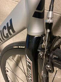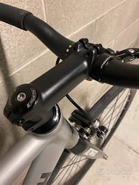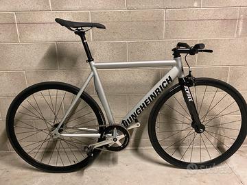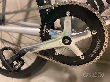 Telaio in alluminio,orizzontale 53 verticale 50,verniciatura by Kolor Cycle,forcella Alpina in carbonio,serie sterzo integrata FSA,manubrio Cinelli pepper,leva freno Promax,freno Miche performance,attacco manubrio no brand 100,reggisella Cinelli,collarino reggisella Miche,guarnitura Miche primato 49T pedivella 175,movimento centrale Miche,ruote Ambrosio alto profilo 30 con pista frenante rettificata e mozzo poteriore flip-flop,ruota libera Miche,catena Miche,sella Decathlon.