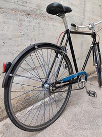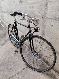 Bicicletta da uomo Stella Veneta mod. Speciale. Stile Vintage, telaio grande, ruote da 28" con cerchi sportivi e raggi blu. Vernice nero lucido con dettagli oro, sellino nuovo. Fari a batteria. Bici da passeggio leggera e veloce