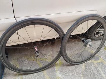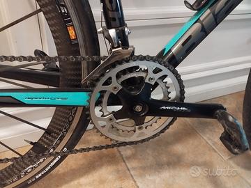 bici da strada bianchi nirone 7, telaio alluminio misura xs, (48cm) forca carbonio, ruote mavic carrbon 50mm camera d'aria più ruote Marchisio profilo 35 tubolari. Rapporti 47/35 guarnitura, e 18/28 cassetta pignoni, sono rapporti giovanissimi g5/6. Cambio 9 velocità Shimano. Anche le seconde ruote sono già fornite della medesima cassetta pignoni, pedali sensori e Garmin non compresi. No spedizione