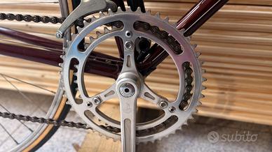 Bici corsa anni ‘70 misura 58x57 (altezza ciclista 185-190 cm), convertita con manubrio da passeggio, assolutamente perfetta e funzionante, colore granata, montata Campagnolo Nuovo Gran Sport tranne i freni (Universal), cerchi Nisi per copertoncino, sella Selle Italia Turbo, portaborraccia e pompa a telaio originali. Sostituendo manubrio e leve freno (con modica spesa) è perfetta per ciclostoriche ed Eroica.