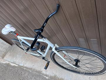 Bellissima bicicletta a scatto fisso con movimento a contro pedale color bianco perlato,rapporto di pedalata 42 a 18 adatto a qualsiasi tipo di strada, Bici costruita sul telaio vintage Legnano completamente restaurata con guarniture, ruote, selle manubrio, tutti i movimenti nuovi. Monta pneumatici Michelin Dynamic sport nuovi, su cerchioni a profilo alto.