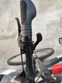 Ruote da 27,5" con aggancio rapido, cambio B-Twin 9 rapporti, freni a disco a cordino con pastiglie praticamente nuove, ammortizzatori anteriori non regolabili, porta borraccia, luci anteriori e posteriori.