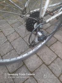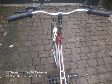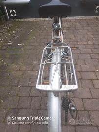 Bici donna da 28" robusta e scorrevole, con tutti componenti funzionanti. La bici ha una sella comoda, luci a LED e freni perfettamente funzionanti. Cambio funzionante con l' anteriore (a 3 velocita') e cambio posteriore (a 5 velocita'), cerchi e telaio inox e cavalletto. La bici è dotata di portabagagli posteriore in alluminio e di un ottimo sistema di chiusura (marca ABUS). E’ tenuta senza difetti, vendo per inutilizzo.