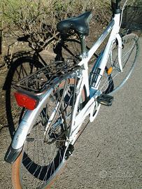 vendo bici da uomo in alluminio bianca con 6 marce , ruote da 28 cestino cavalletto manopole buone parafanghi,luce anteriore a batteria portapacchi posteriore buono adatto per pesi e borsone portaoggetti, ,,bici restaurata e lubrificata
