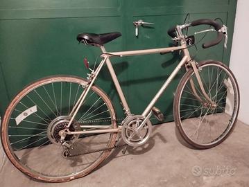 Bici uomo, molto particolare, colore oro, manubrio da corsa.