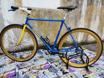 Telaio 54 (M) ruote ad alto profilo con predisposizione per pignone fisso sul lato sinistro,cambio a 4 rapporti con manettino al telaio,la bici è stata personalizzata con manubrio flat e ruote ad alto profilo di derivazione fixie,telaio molto particolare e unico nel suo genere.