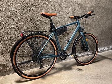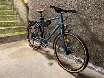 Una bici tuttofare, se cerchi una bici da città ben rifinita, leggera e confortevole per macinare chilometri o per affrontare un percorso con dislivello, allora è la scelta perfetta! Anno 2022, pochi Km, tutto in ordine, nessun lavoro da fare. taglia L per altezze tra 175 e 185 Montando il seggiolino sul portapacchi posteriore (se servisse vendo anche quello), l'ho usata tanto per andare in giro con mia figlia, carica fino a 27kg! Ottima per andare al lavoro mettendo le borse laterali o per giri domenicali lungo ciclabili, anche sterrate. Potenti luci automatiche con generatore nel mozzo ruota che non da attrito, parafanghi in metallo e cavalletto molto stabile anche con bici carica. Forcella ammortizzata per un ottimo confort sulle buche o in off-road. Cambio e guarnitura SRAM a 11 velocità(36 + 11/42), perfetta anche per salite ripide. Caratteristiche complete sul sito Decathlon. Ho appena messo gomme nuove leggermente tassellate per una migliore aderenza sullo sterrato ma non penalizzare la scorrevolezza, cedo con anche un treno di gomme semi-slick. Prezzo del nuovo 850.00€, vendo a 550€ leggermente trattabile. Contatti tramite la messaggistica di subito.it