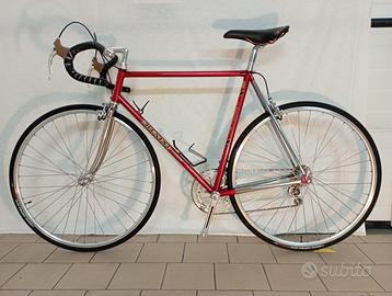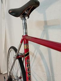 Bicicletta da corsa Chesini x-uno del 1983 READY TO RACE. Telaio Columbus Sl con scatola Cinelli, misura cm 56 x 55, verniciatura originale conservata, forcella e carro cromovelati, gruppo Campagnolo super record ( epoca ) completo, tranne leve record ma modificate come super, pedali super record pista titanio con cinghietti Silva, corona reggisella e levette cambio pantografate, ruote a 36 raggi con "copertoncini vittoria corsa control grafene tlr da 25 mm, pattini freno speciali, catena, nastro, cavi e guaine, camere d'aria, sfere sterzo" tutti nuovi, smontata verificata e ingrassata completamente in ogni sua parte, sella rolls S Marco, rapporti 53/42 pedivelle 170 mm, pignoni 14/26 regina, manubrio 3t. Aggiungo gratis, altra coppia di pedali, puntapiedi, cinghietti, ruota libera con altri rapporti, due pipe manubrio di differente misura per eventuale adattamento e barattolino di colore originale. Vendo a euro 1350, consegna a mano zona soave, Tregnago, Arzignano , solo per realmente interessati, scrivimi whatsapp al 3480936018