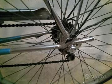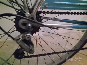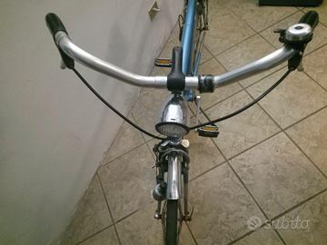 Stupenda bicicletta da città (o da cicloturismo leggero) in stile classico, di marca Zecchini, un nome storico legato alla tradizione ciclistica italiana Caratteristiche Principali Telaio: In acciaio con giunzioni classiche, verniciato in un azzurro metallizzato. Bici "sportiva", con canna alta. Manubrio: Modello "Torino" o da città, che permette una posizione di guida rialzata e confortevole. È equipaggiato con manopole in gomma nera e leve del freno in alluminio. Cambio esterno (probabilmente a 5 o 6 velocità). Si notano i manettini del cambio posizionati sul tubo obliquo, una configurazione tipica delle bici vintage degli anni '70 e '80. Accessori: Portapacchi Posteriore in metallo cromato, robusto e adatto per borse o cestini. Parafanghi: In tinta con il telaio o in metallo leggero, completi di paraspruzzi. Impianto Luci: È presente una dinamo sulla ruota posteriore collegata a un fanale posteriore rosso; il faro anteriore è visibile vicino al manubrio. Condizioni perfette, usata pochissimo. Classica , top 💙 consegna a mano su Brescia, Mantova, Verona e province