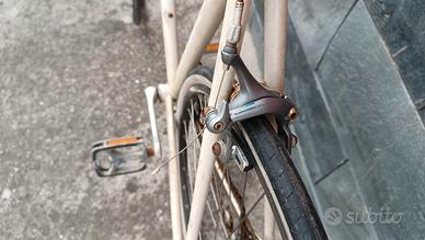 Vendo bicicletta vintage della Pinarello, Con un cambio a levette sul tubo obliquo della Shimano 600 Dura-ace con una doppia corona davanti e 8 rapporti dietro. Un manubrio della Italia manubri. Forcella Columbus e telaio Pinarello. Gli pneumatici sono ancora funzionanti. Il prezzo è basso perché la bici ha bisogno di un restauro. La bicicletta è adatta a una persona alta da 155 cm a 170 cm.