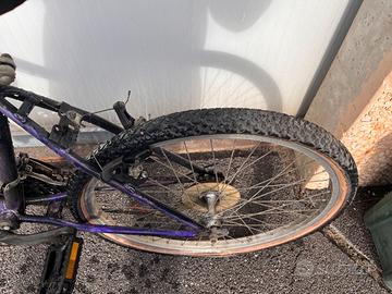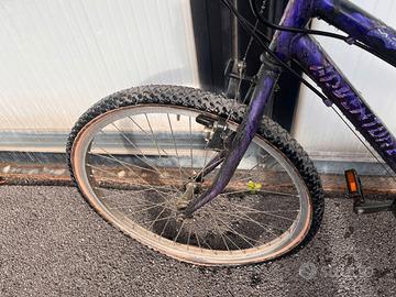 Vendo bici viola con cambio e porta bottiglia. Le gomme, purtroppo, sono sgonfie. Richiede pulizia e manutenzione.