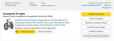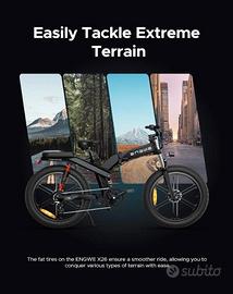 ENGWE X26 si fa strada come una bicicletta elettrica fuoristrada spinta da un robusto motore ad alte prestazioni con un sistema di batterie duali da 48V 19.2Ah/10Ah, raggiungendo senza sforzo velocità fino a 25 km/h e sbloccandosi per conquista pendenze fino al 30°. Così una navigazione senza soluzione di continuità su terreni diversi.X26 bici elettrica presenta una configurazione innovativa a doppia batteria, e un'impressionante autonomia fino a 95 miglia. A completare questa capacità c'è l'integrazione senza soluzione di continuità di tre diverse modalità di guida: ECO, NORMAL e SPORT, insieme al sistema a 8 velocità.una distintiva sospensione a triplo stadio - ammortizzatori idraulici anteriori, meccanici centrali e ammortizzatori ad aria posteriori - triplicando l'efficienza dell'assorbimento degli urti per corse resilienti a velocità più elevate su terreni impegnativi. Il telaio pieghevole innovativo migliora la praticità, con dimensioni di 40x29x42 pollici.A un sistema di controllo intelligente della velocità per il mantenimento costante della stessa. La sua intuitiva interfaccia LCD fornisce dati in tempo reale sulla velocità, lo stato della batteria e le modalità. Insieme ai fari e ai fanali automatici per una maggiore visibilità, l'X26 è dotato anche di porte di ricarica per cellulari e fari sensibili alla luce, migliorando la sicurezza e la comodità.lo usatta pochisimo...30-40 km...la vendo per pasagio a moto...si vede nelle imagini il giorno della consegna...quindi non ha neanche un messe...lo compratta con 2000 euro, e la vendo per 1600 euro..trattabile ma non troppo
