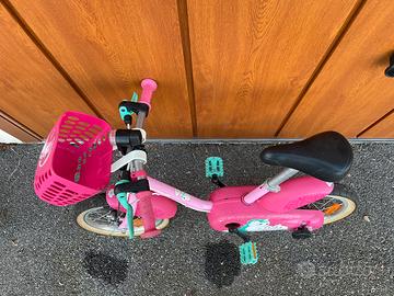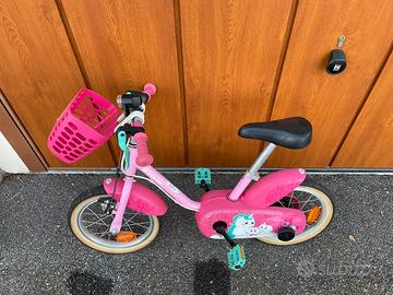 Bicicletta per bambina della Btwin da 14” modello Unicorn. Fascia d’età 3-6 anni. Completa di cestino, luce anteriore, porta bambole posteriore e rotelle. Con salita in sella bassa e provvista di paracatena e carter pedali per maggiore sicurezza. In ottime condizioni.