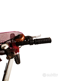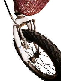 Bici bianca e rosa con cestino. La carrozzeria non è perfetta, ma la bicicletta in generale è perfettamente funzionante, le gomme e i freni sono in ottimo stato. Il campanello è quasi nuovo. Misura 16". Adatta a bambine da 4 e 7 anni.